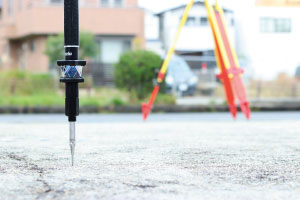 ● トータルステーションとプリズムを使用した建築の墨出し工程で、