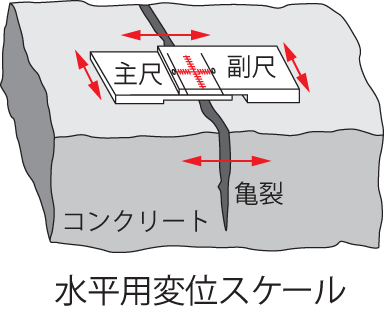 ■価格( )内税込み:¥1,200(¥1,320)■型式:HIBIMIRU(H) (水平スケール)■特長:●水平用変位スケール ●市販のエポキシ接着剤を用いてクラックを跨いで接着します。 ●主尺と副尺により1/10mmまで計測できます。■仕様 ●サイズ:70×25×8mm 2ヶ ●取付時サイズ:119×28×8mm ●計測制度:1/10mm