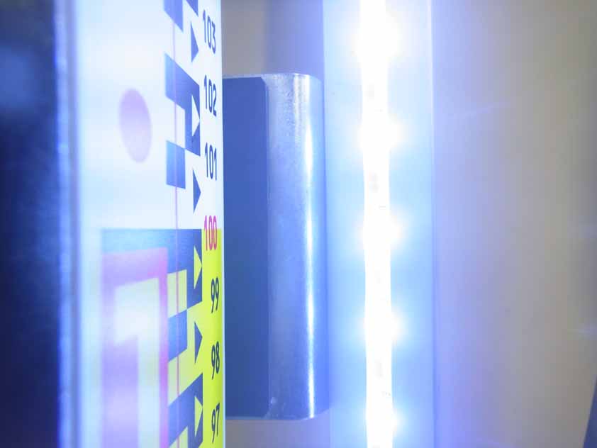 夜間やトンネル内工事など暗闇でもスタッフ目盛がくっきり読める NETIS登録番号:QS-180003-VE
