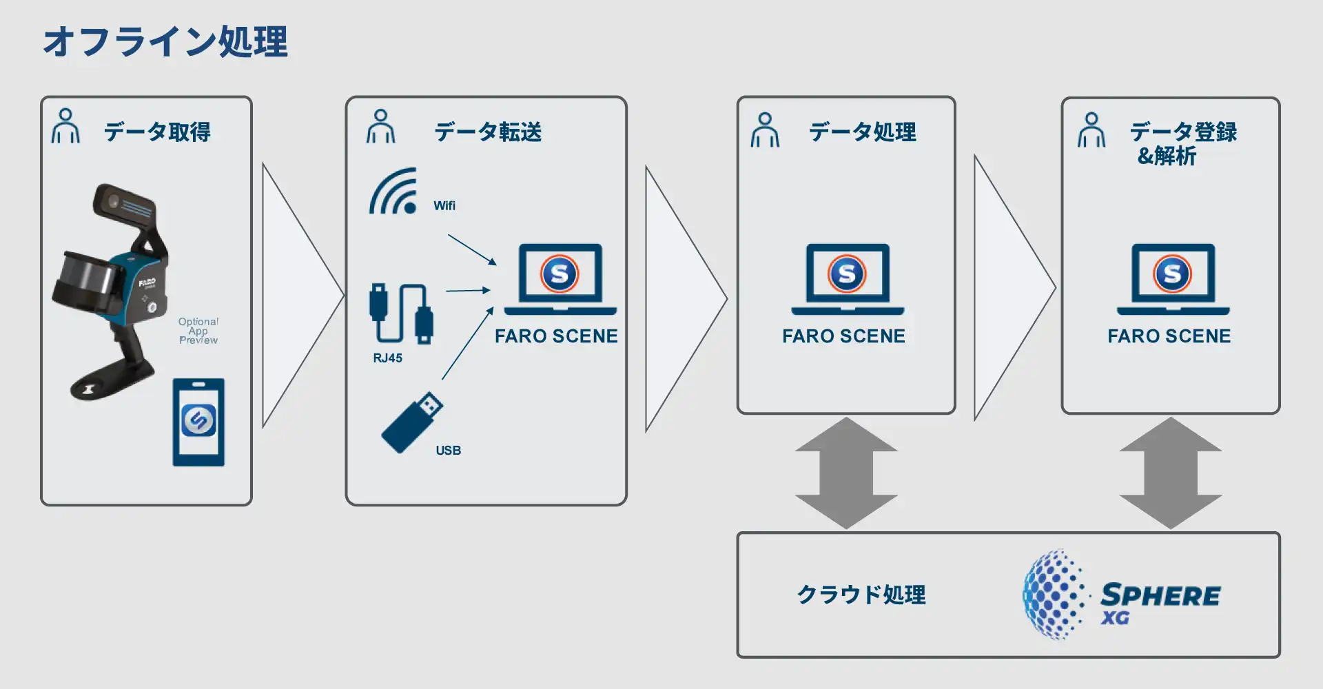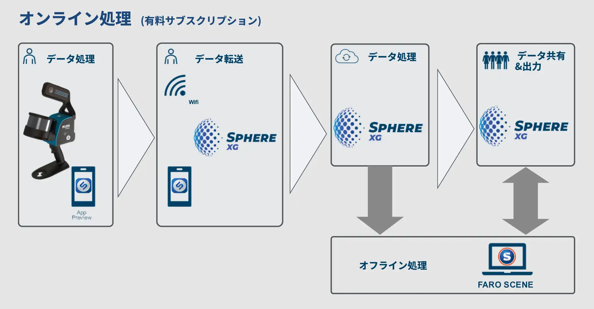 Orbis Premiumは、解析方法としてFARO SCENEによるローカルでの処理かSphere XG(※)によるクラウド処理のいずれかを選択することができます。